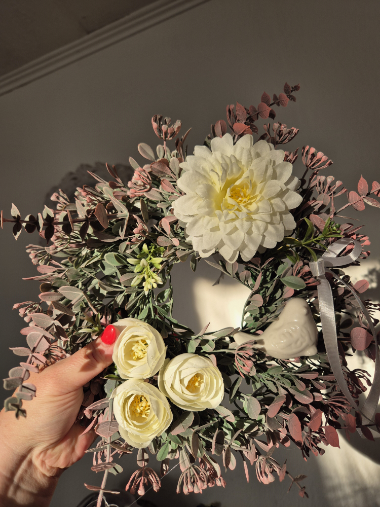selyemvirag koszorú pinkes 27 cm/fehér madárral