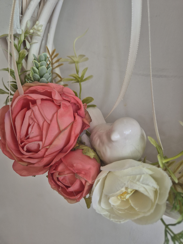 vessző koszorú vegyes 30 cm fehér alapra fehér kerámia madárkával