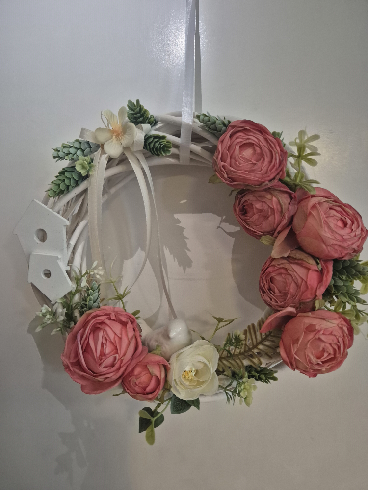 selyemvirag koszorú pinkes 27 cm/fehér madárral