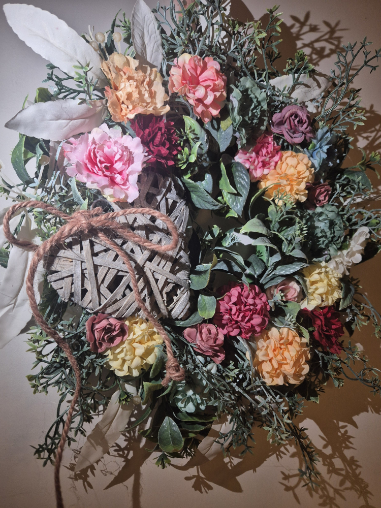 A kompozíció központi eleme egy rusztikus, fonott fa szív, melyet gondosan válogatott rózsák, boglárkák és üde zöld kiegészítők ölelnek körbe.