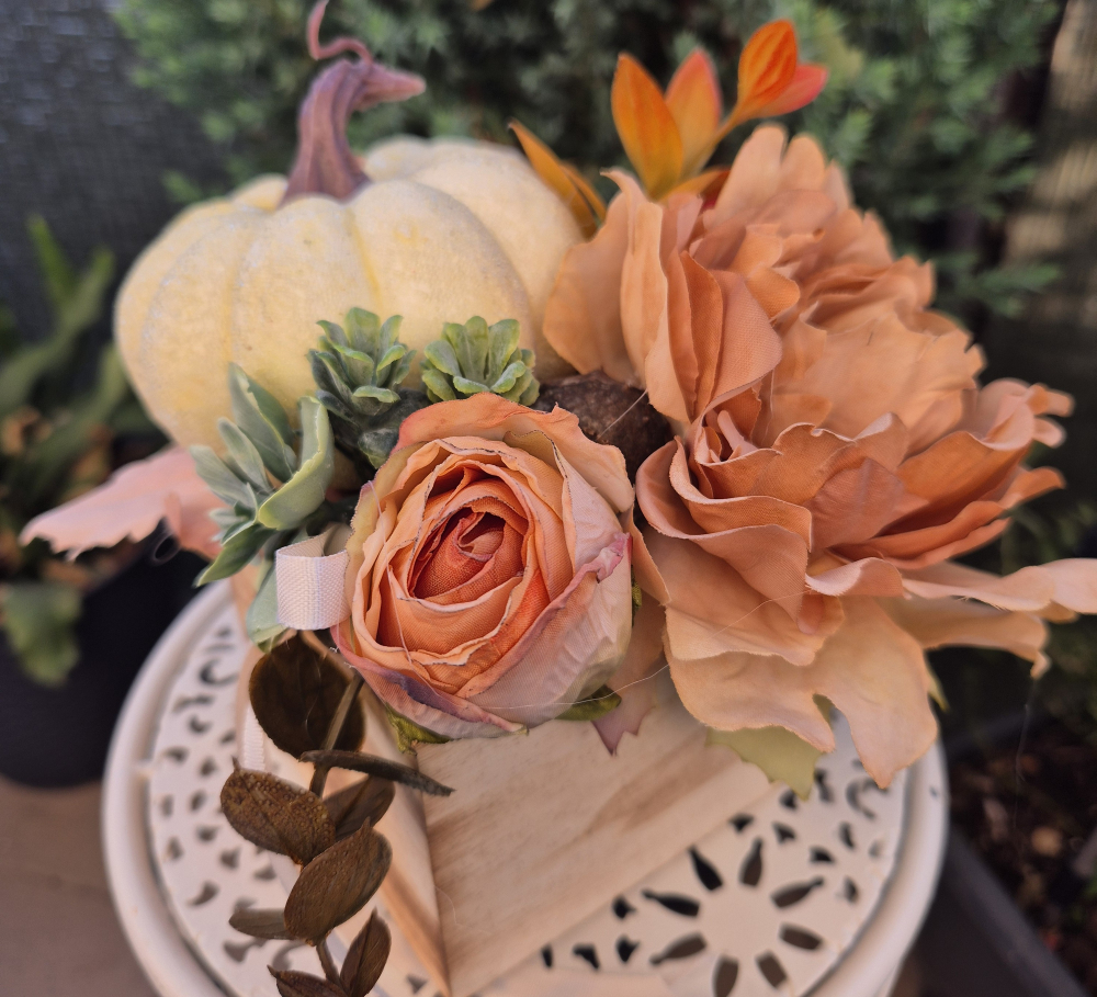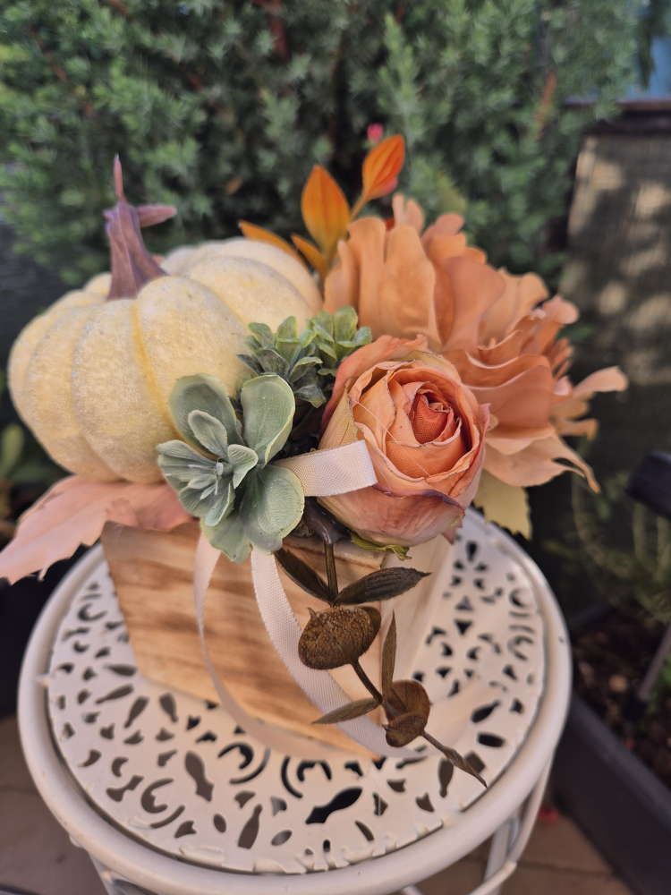 Ez a különleges fadobozos dekoráció a letisztult elegancia megtestesítője. A pasztell, világos sárga prémium minőségű tök különleges textúrájával úgy hat, mintha finom reggeli harmatcseppek csillognának rajta. A gondosan válogatott dekorvirágokkal kiegészítve igazán exkluzív, egyedi hangulatot teremt – tökéletes választás prémium őszi dísznek vagy különleges ajándéknak.