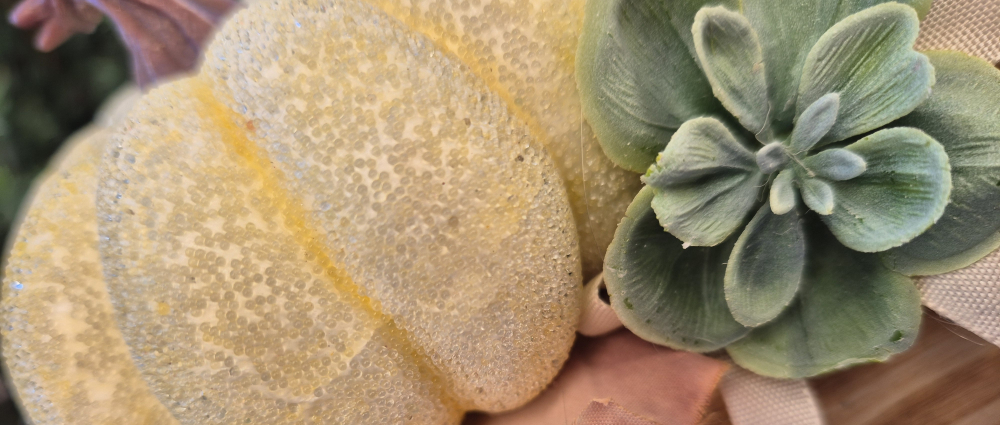 A pasztell, világos sárga prémium minőségű tök különleges textúrájával úgy hat, mintha finom reggeli harmatcseppek csillognának rajta. A gondosan válogatott dekorvirágokkal kiegészítve igazán exkluzív, egyedi hangulatot teremt – tökéletes választás prémium őszi dísznek vagy különleges ajándéknak.