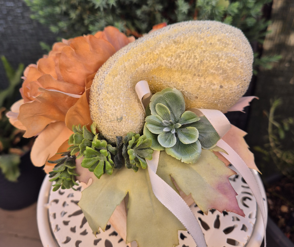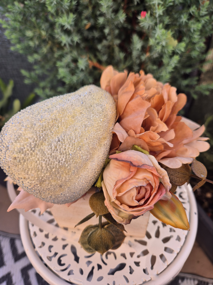 Ez a különleges fadobozos dekoráció a letisztult elegancia megtestesítője. A pasztell, világos sárga prémium minőségű tök különleges textúrájával úgy hat, mintha finom reggeli harmatcseppek csillognának rajta. A gondosan válogatott dekorvirágokkal kiegészítve igazán exkluzív, egyedi hangulatot teremt – tökéletes választás prémium őszi dísznek vagy különleges ajándéknak.