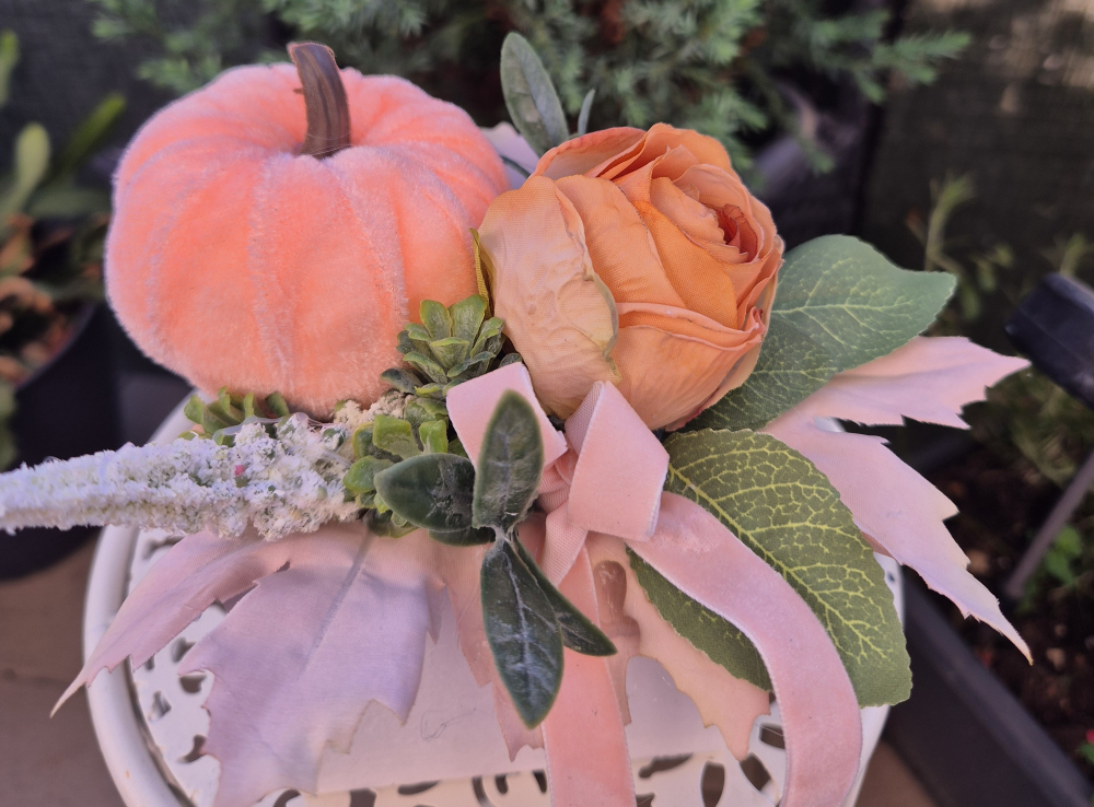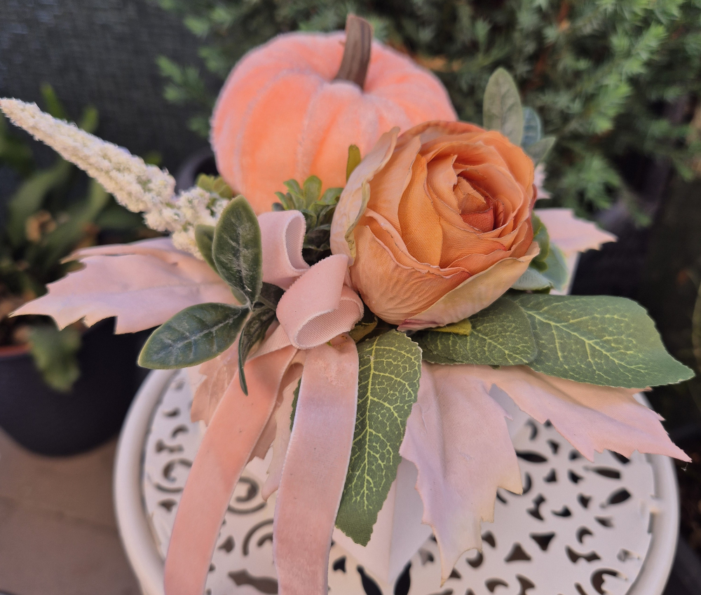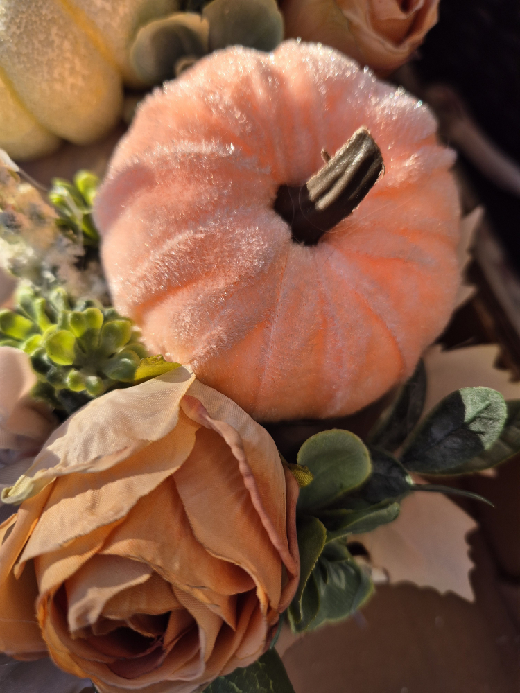 A gondosan válogatott dekorvirágokkal kiegészítve igazán exkluzív, egyedi hangulatot teremt – tökéletes választás prémium őszi dísznek vagy különleges ajándéknak