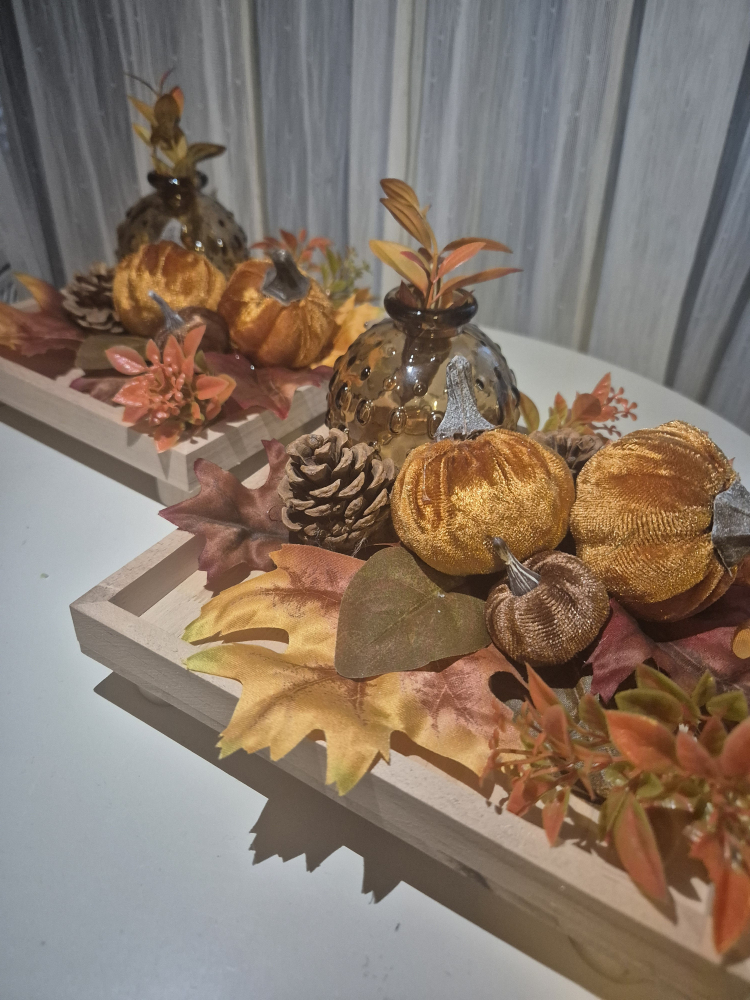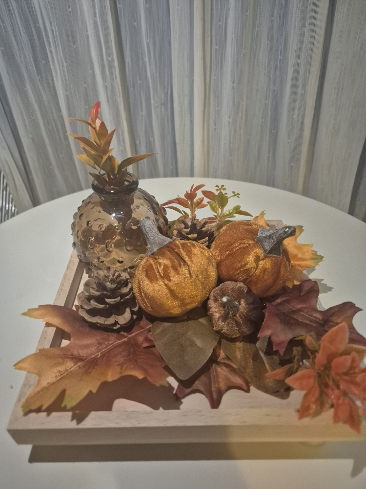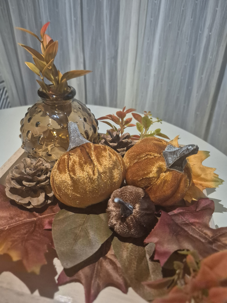 Ez a kézzel készült, prémium minőségű asztaldísz nem csupán dekoráció – egy darabka őszi varázslat. A puha bársonytök, az aranyló falevelek és a természetes falap együttese melegséget, harmóniát és eleganciát csempész minden enteriőrbe.