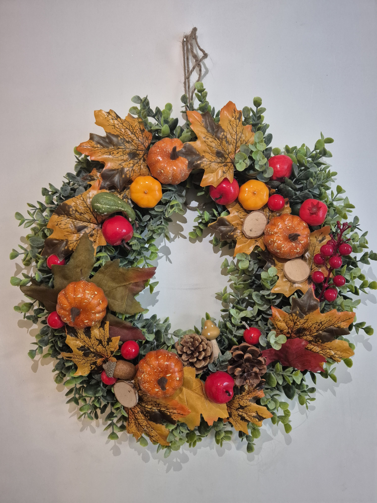 Őszi bőségkoszorú tökökkel és almákkal 43 cm.