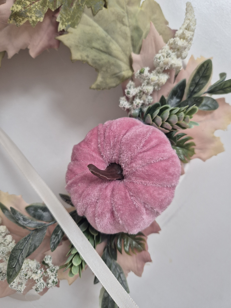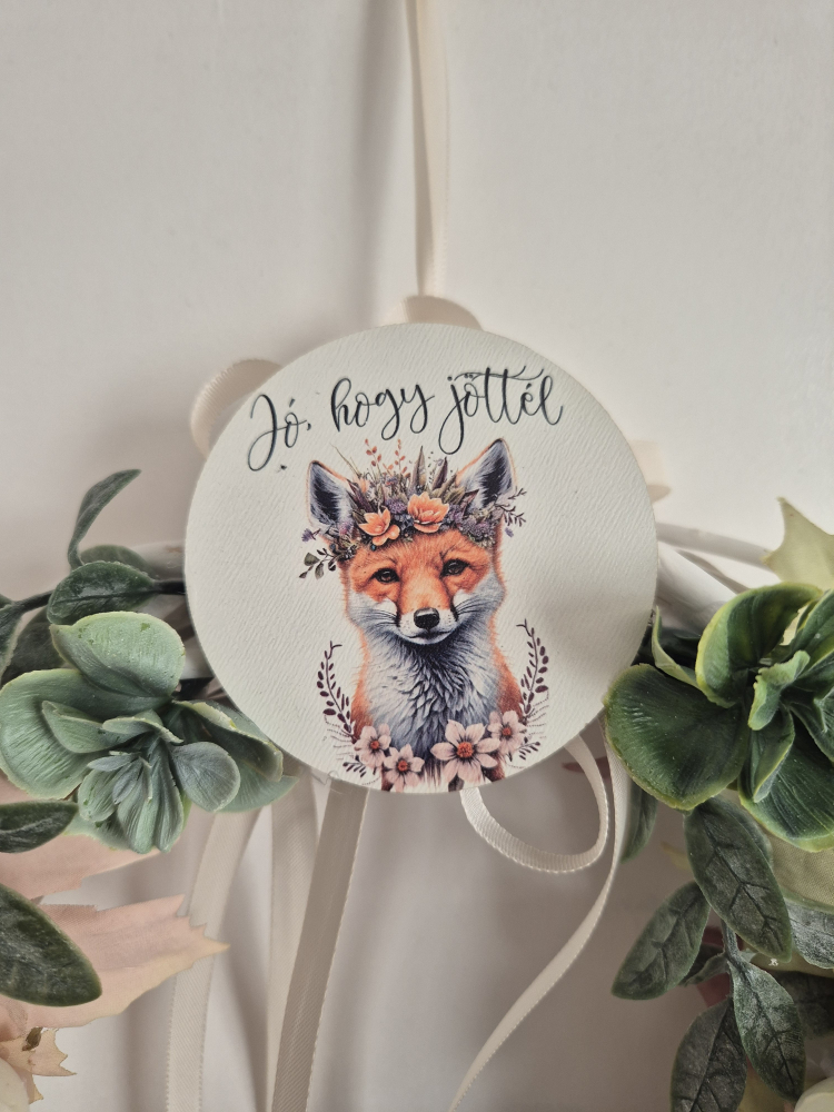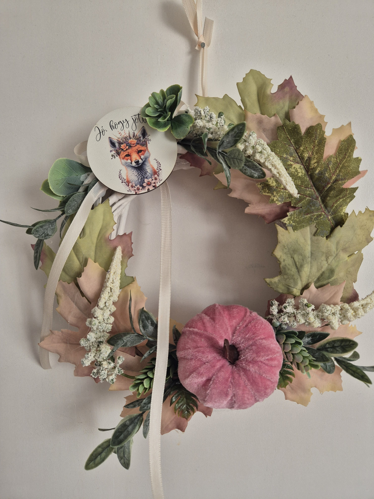 Őszi prémium kopogtató újragondolva – róka, Isten hozott felirat, rózsaszín és tökökkel, a megszokott színek helyett.