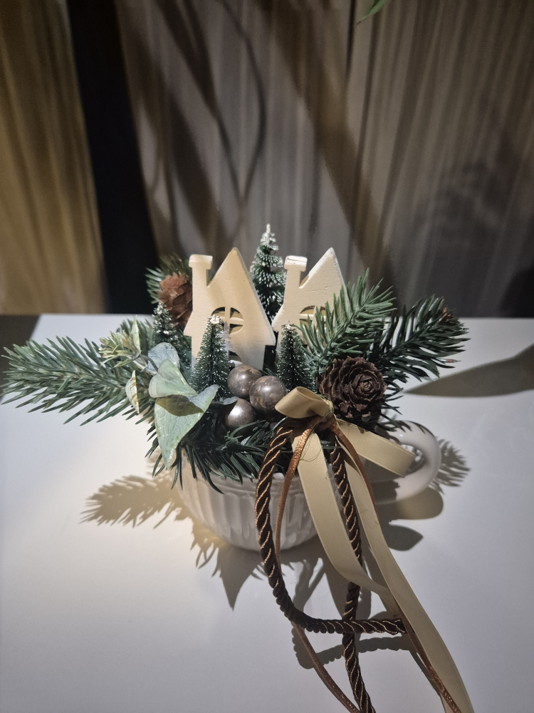 A finom selyemszalag, az apró üveggyöngyök és a természetes hatású díszítőelemek együtt egy igazán elegáns, ugyanakkor otthonos hangulatot teremtenek.