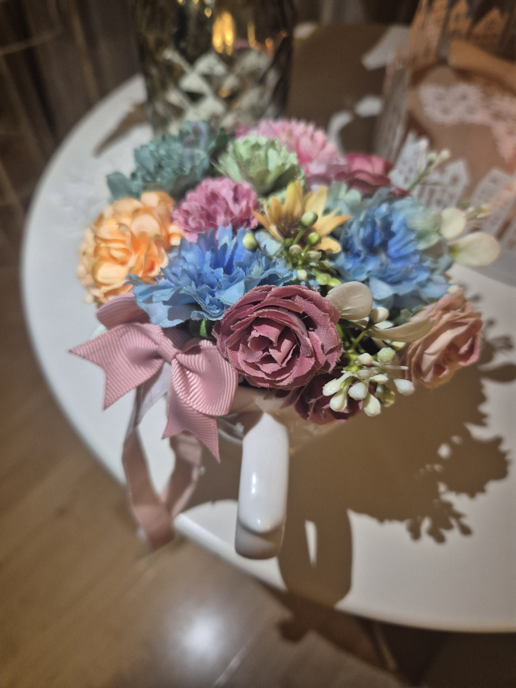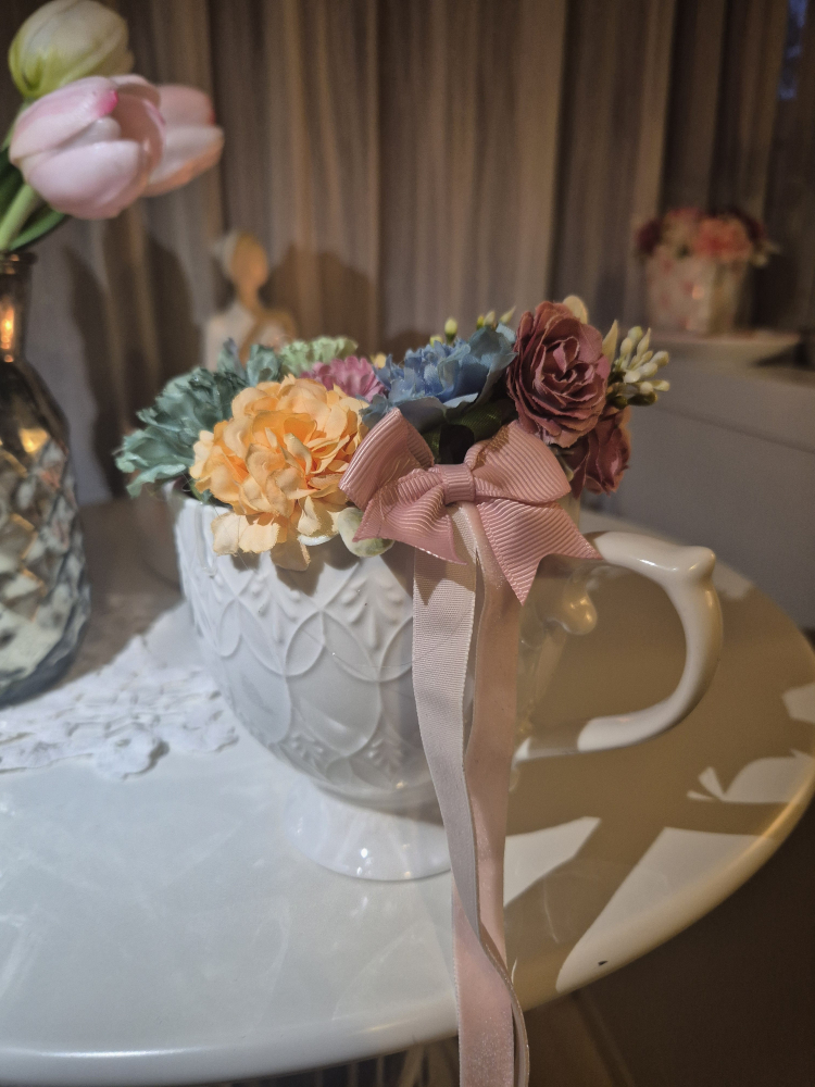 Ez nem csupán egy kaspó, hanem egy vintage stílusú, dombornyomott kerámia bögre, amelybe dús, élethű selyemvirág csokrot álmodtunk meg.