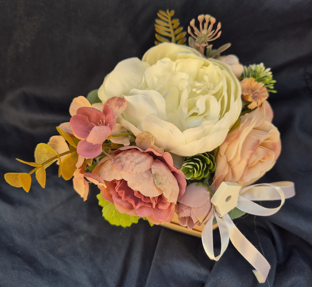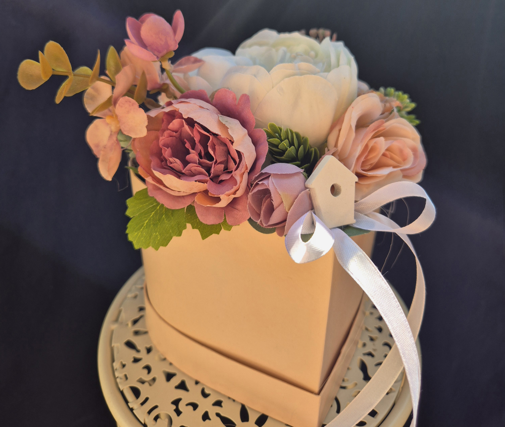 Romantikus virágboxunk nyírfa dobozban. Merülj el a romantika időtlen bájában ezzel a kézzel készített művirágboxszal!