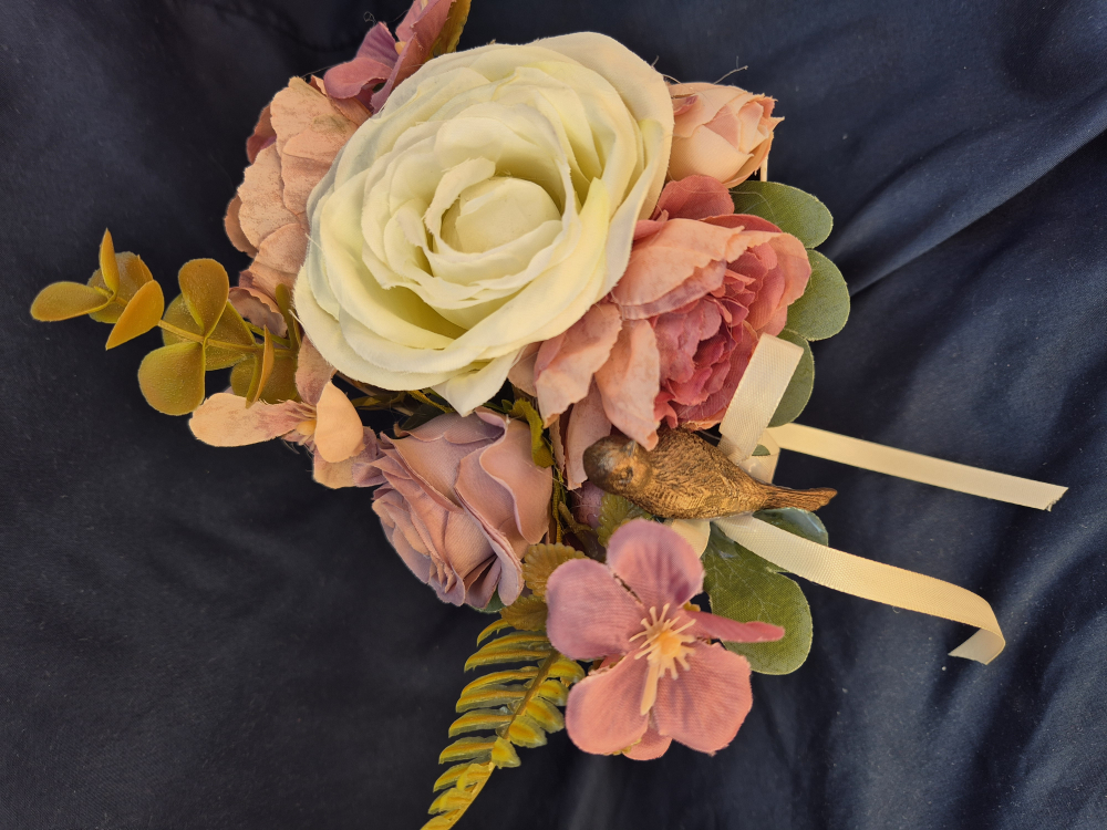 Finom színekkel kombinált virágbox rózsaszín szívben antik madárkával