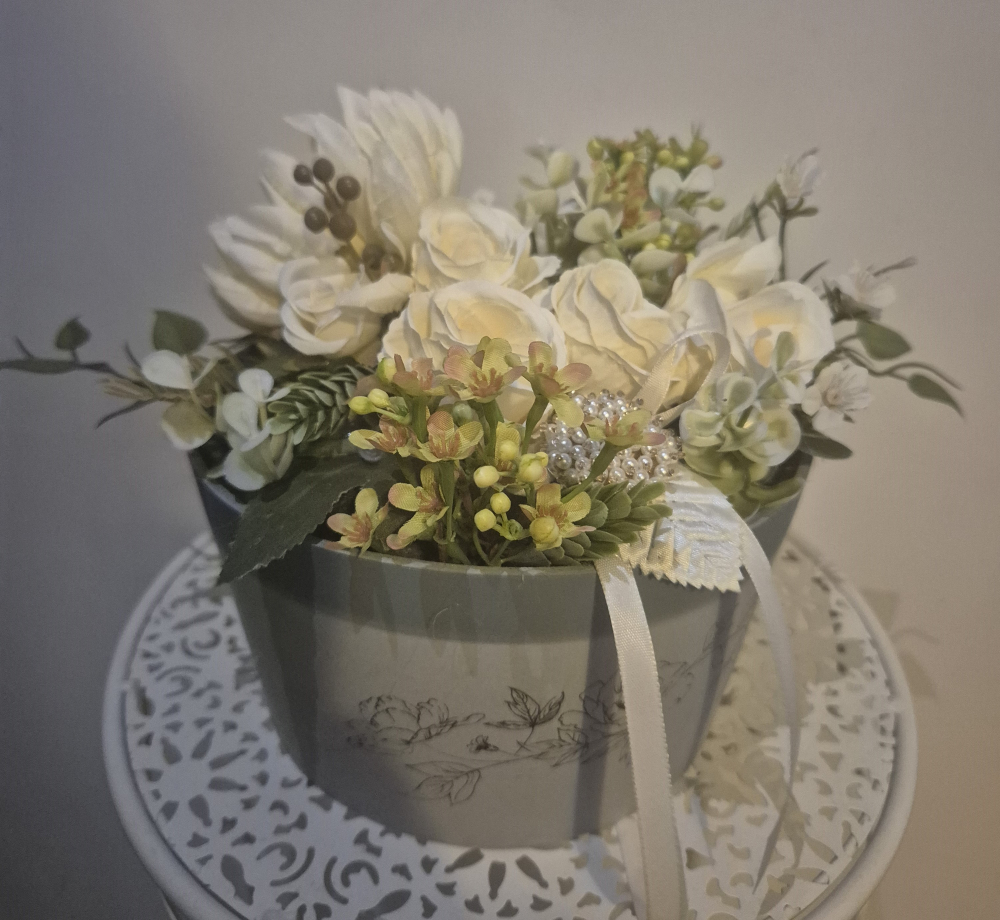 Romantikus virágboxunk nyírfa dobozban. Merülj el a romantika időtlen bájában ezzel a kézzel készített művirágboxszal!